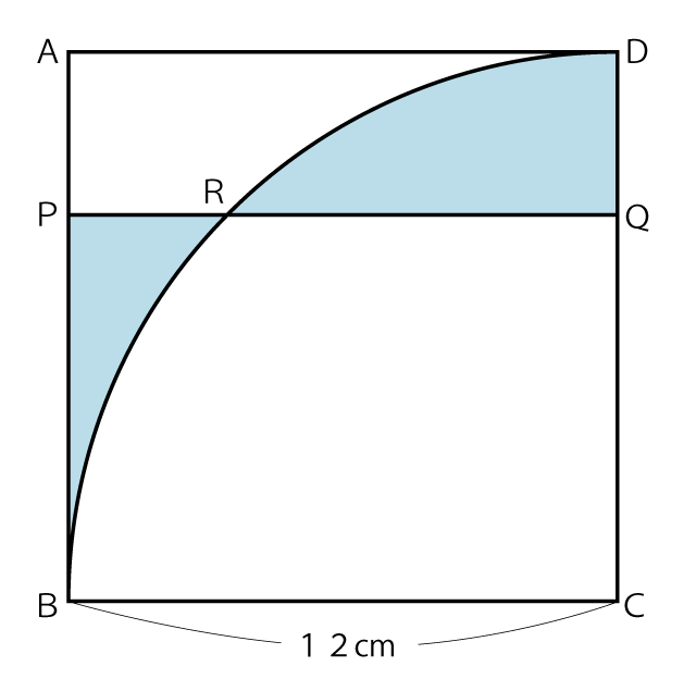 上の図のように、一辺の長さが12cm正方形ABCDの内部に、頂点Cを中心とし、半径12cmの円孤を描きました。